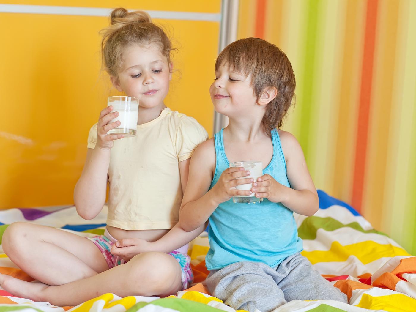 Обои Маленькие мальчик и девочка со стаканами молока в руках