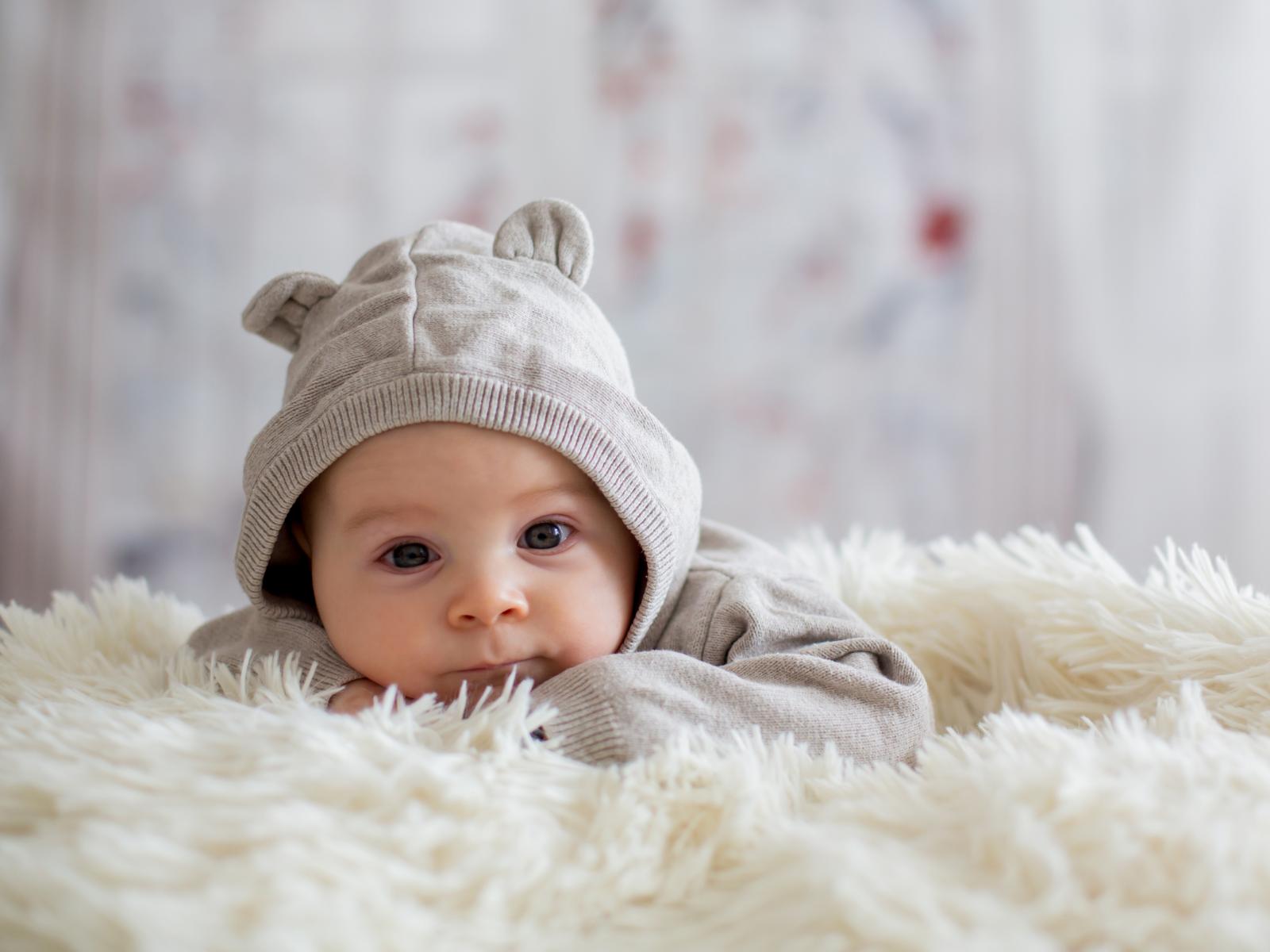 Обои Маленький ребенок лежит на белом меховом покрывале