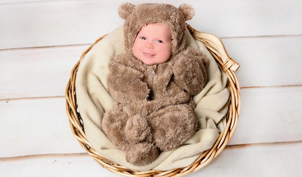 Обои Улыбающийся грудной ребенок в костюме мишки лежит в корзине