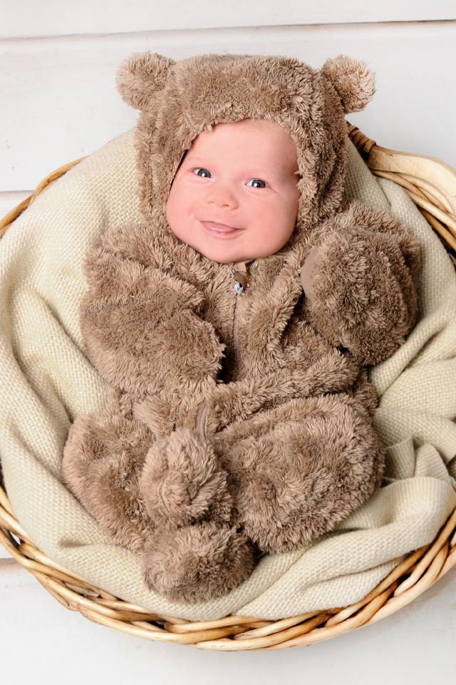 Обои Улыбающийся грудной ребенок в костюме мишки лежит в корзине