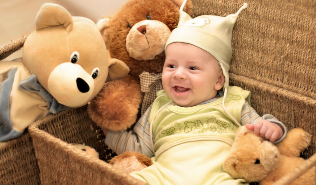 Обои Грудной улыбающийся ребенок в корзине с игрушками