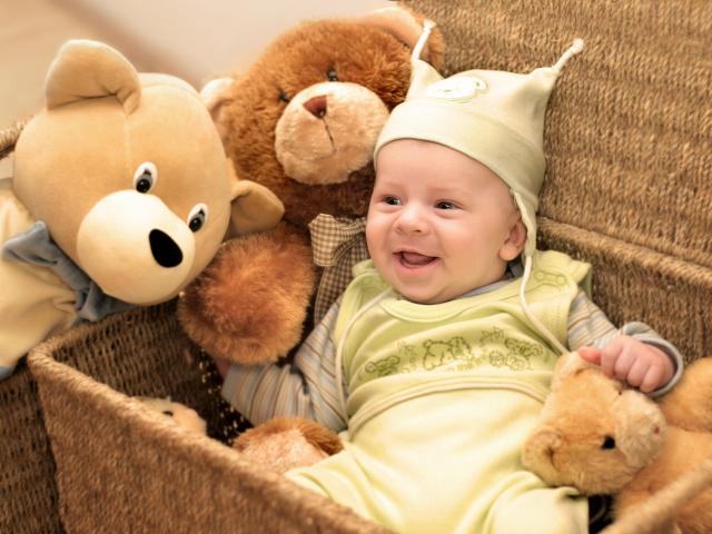 Обои Грудной улыбающийся ребенок в корзине с игрушками