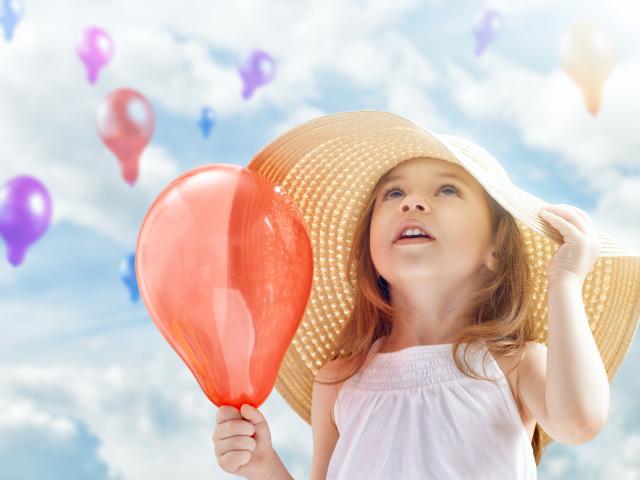 Обои Девочка в большой шляпе с красным надувным шариком