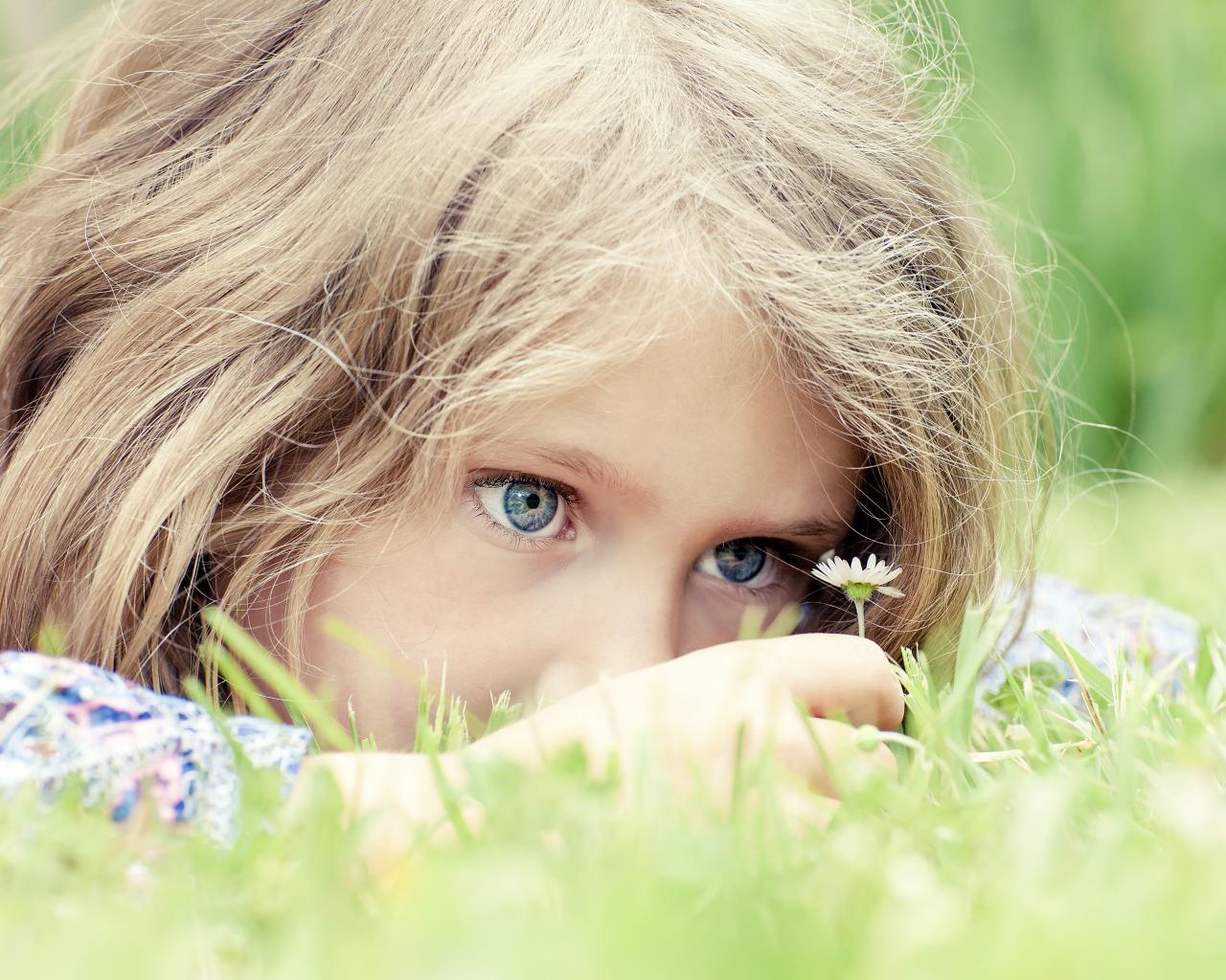 Обои Маленькая голубоглазая девочка на траве с ромашкой