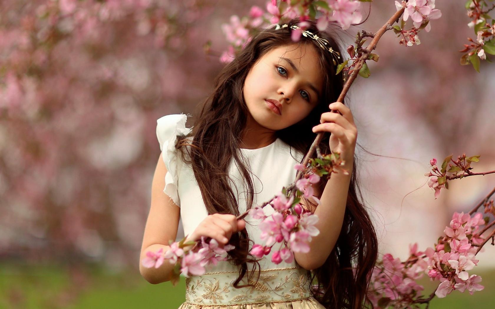 Обои Маленькая девочка у цветущей розовыми цветами ветки
