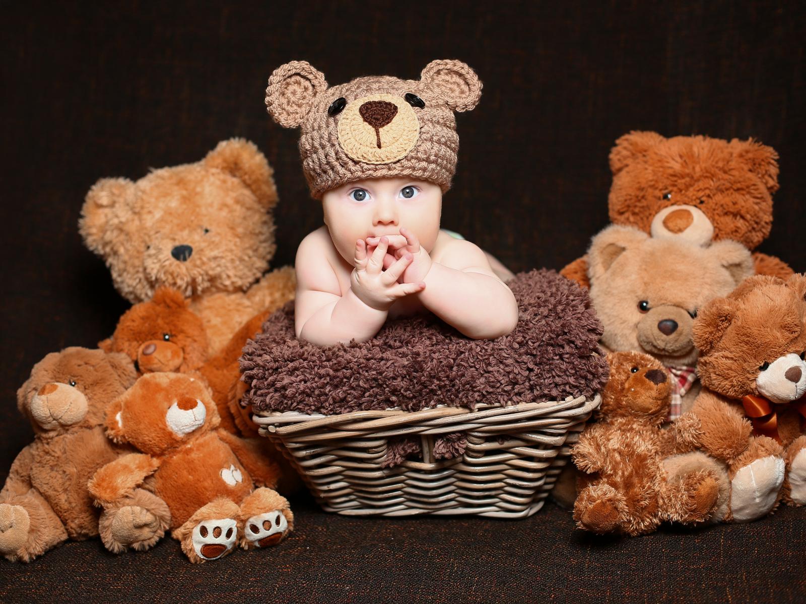Обои Маленький ребенок в вязанной шапке с игрушечными медвежатами