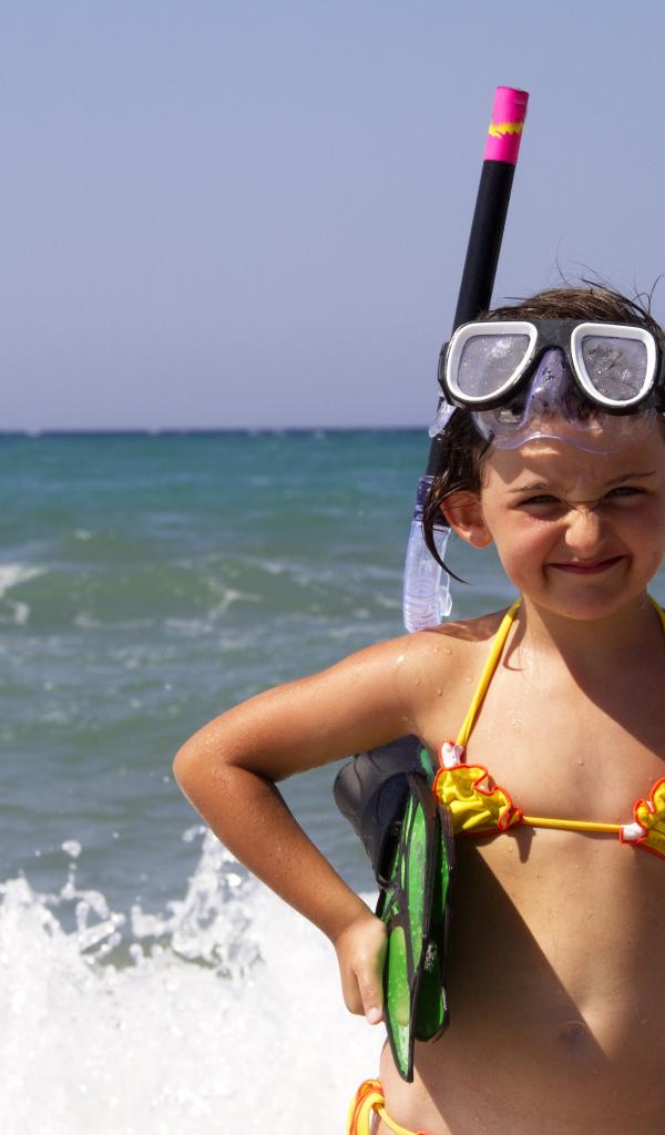 Обои Маленькая девочка в очках и с ластами на море