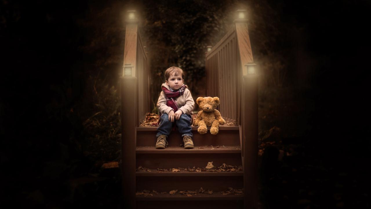 Обои Маленький мальчик сидит с игрушечным мишкой на ступеньках