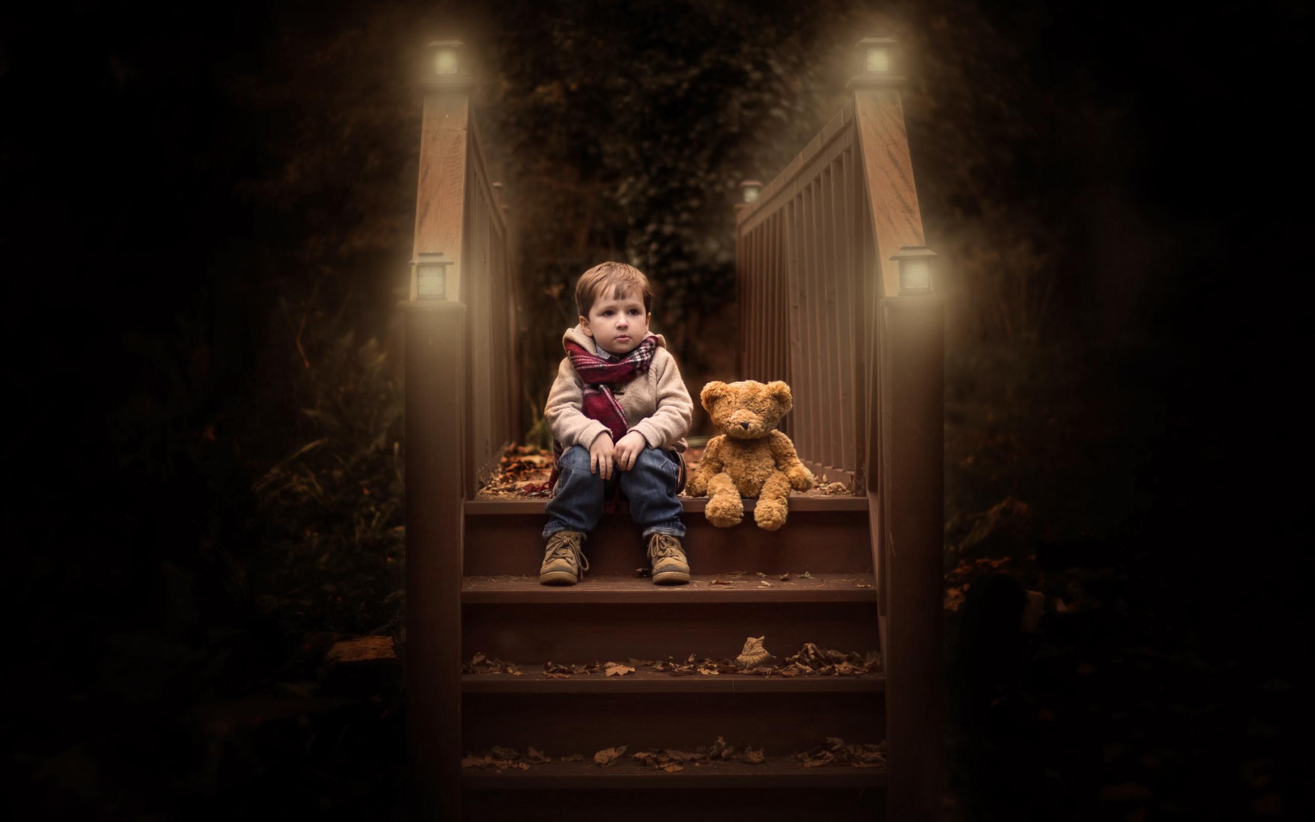 Обои Маленький мальчик сидит с игрушечным мишкой на ступеньках