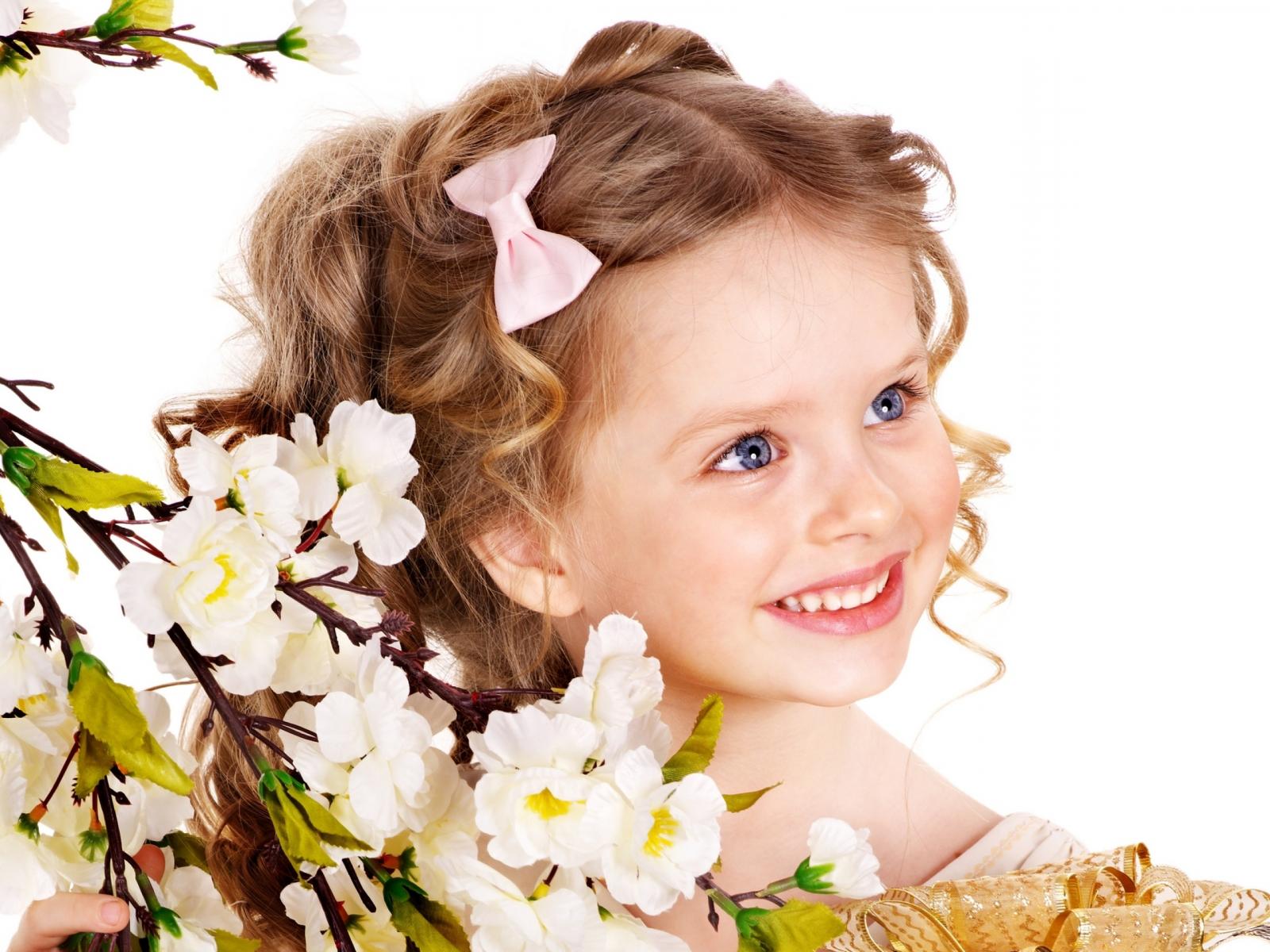 Обои Маленькая улыбающаяся девочка с цветущей веткой