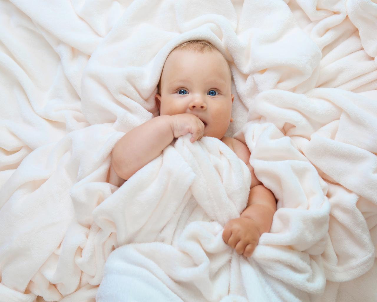 Обои Маленький голубоглазый ребенок в покрывале
