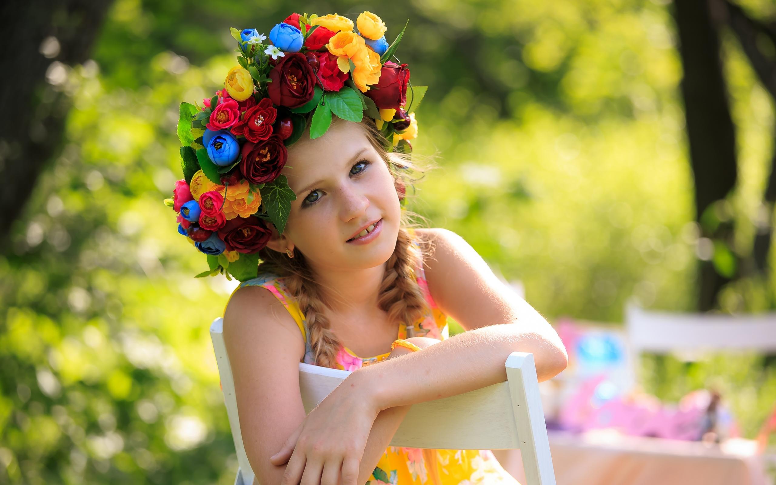 Обои Красивая девочка с венком на голове сидит на стуле