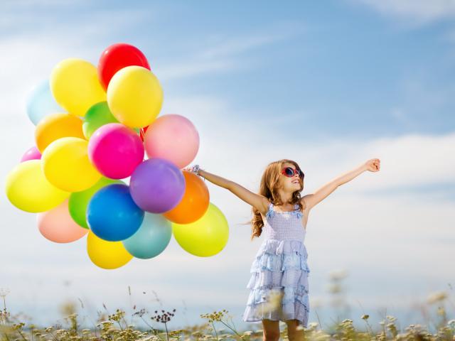 Обои Маленькая девочка держит в руке много воздушных шаров