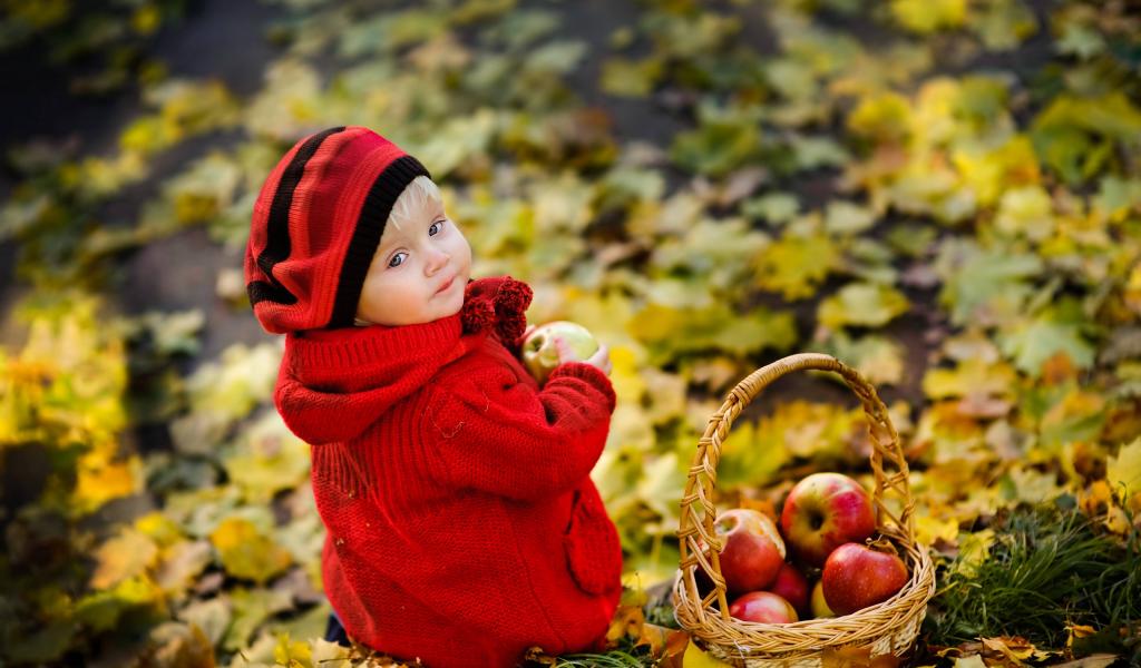 Обои Маленькая девочка с корзиной яблок осенью