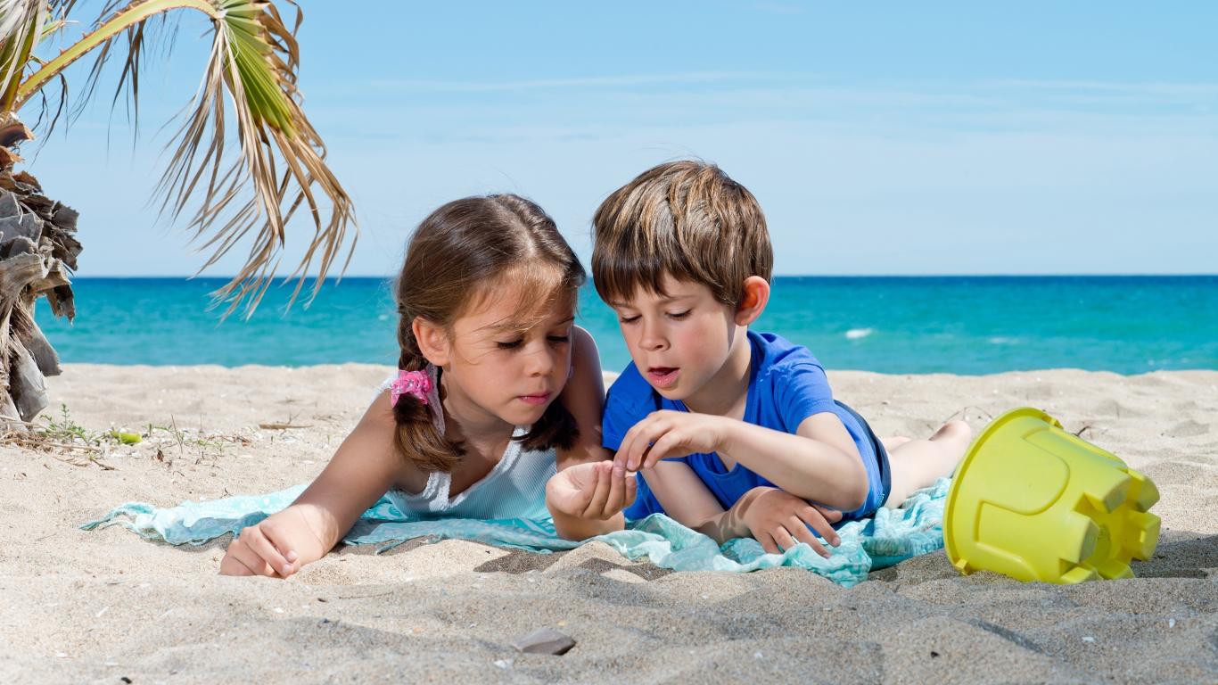 Обои Маленькие мальчик и девочка играют на песке на пляже