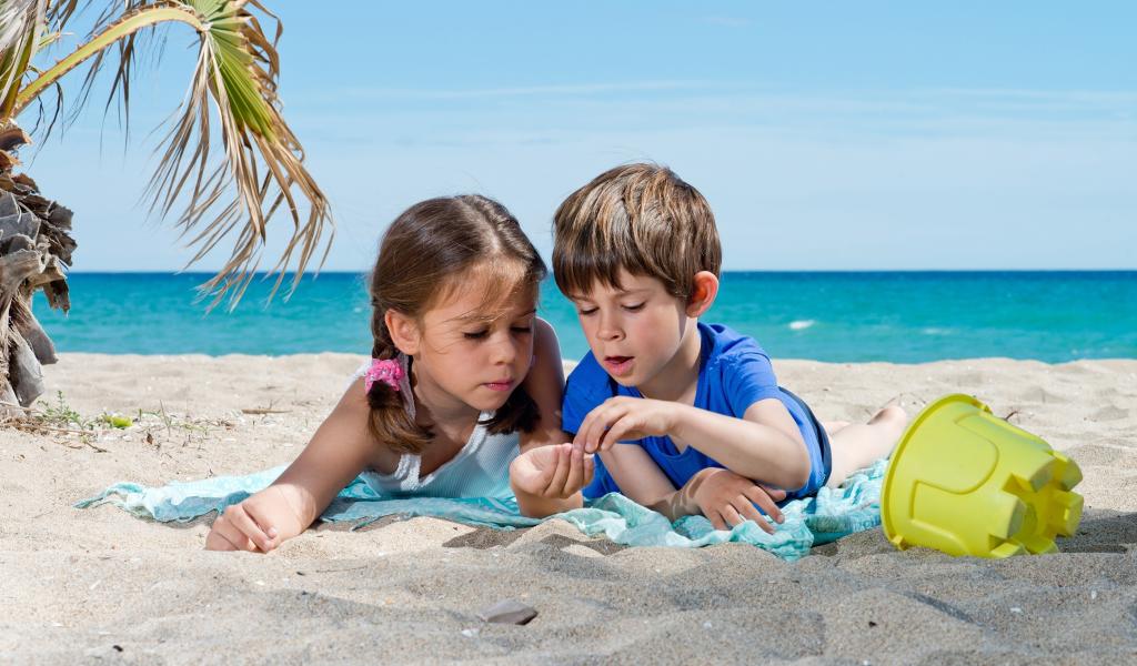 Обои Маленькие мальчик и девочка играют на песке на пляже
