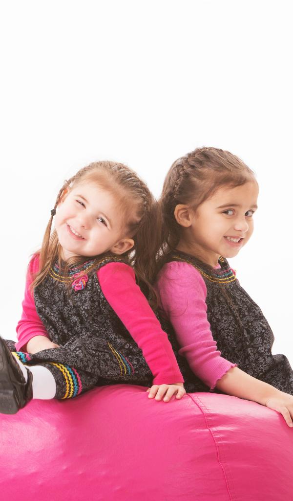 Обои Две маленькие девочки сидят на красном мягком шаре