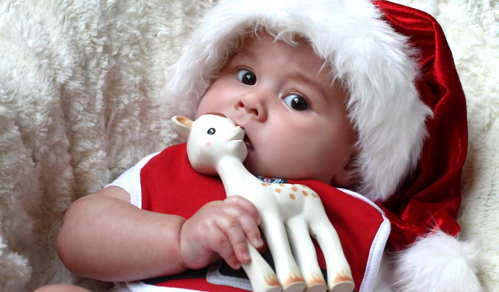 Обои Маленький ребенок в новогодней шапке с игрушкой в руке
