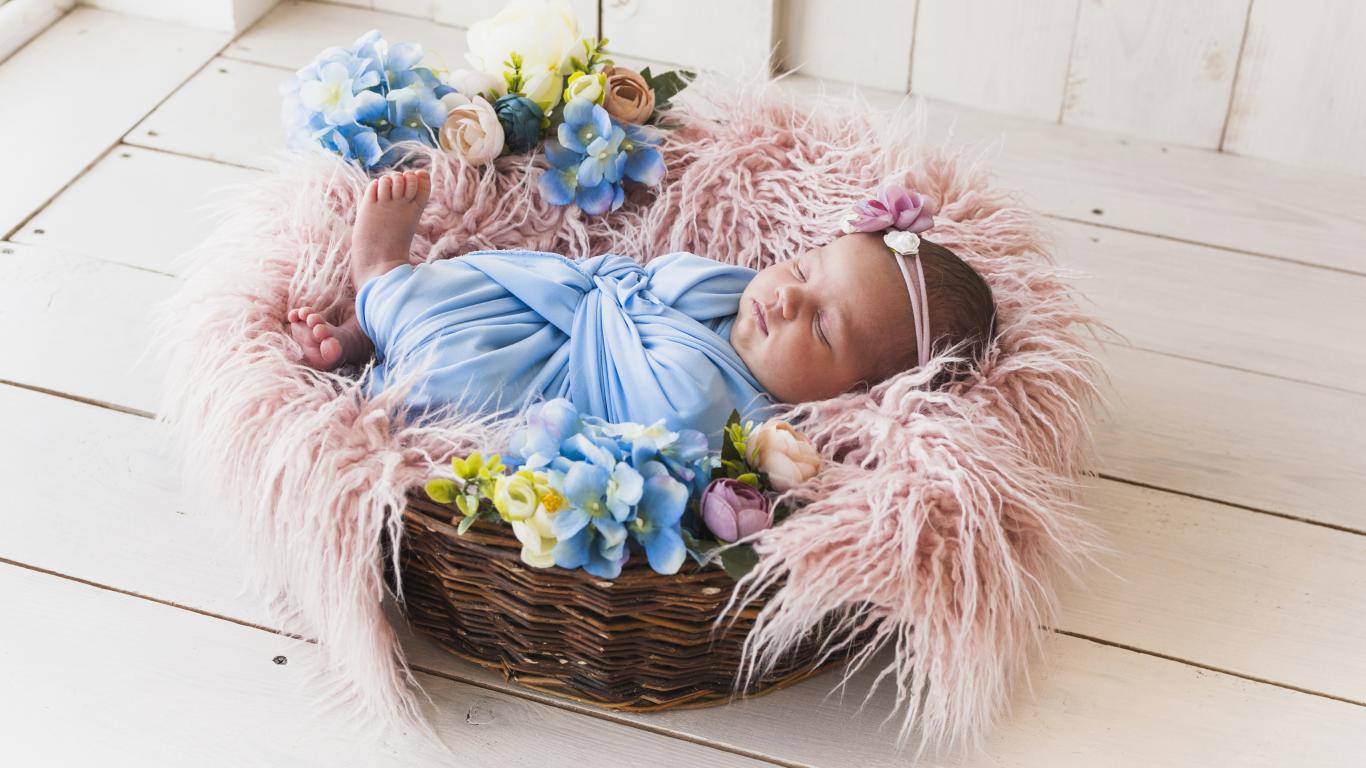 Обои Маленький грудной ребенок спит в плетеной корзине
