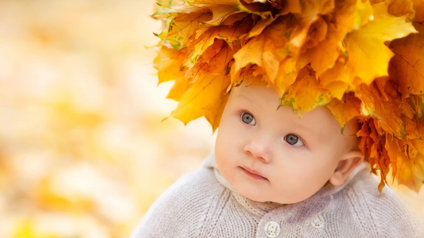 Обои Маленький милый ребенок с венком из желтых листьев на голове