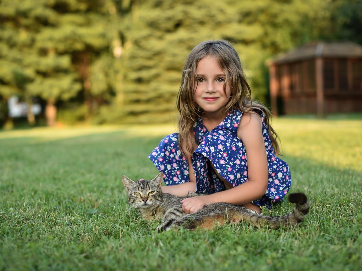 Обои Маленькая девочка сидит на зеленой траве с серым котом