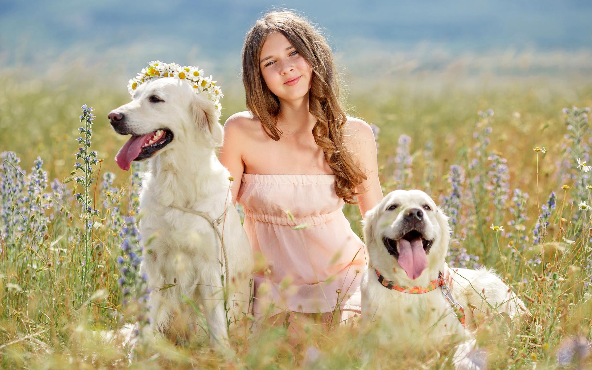 Обои Красивая девочка шатенка с большими собаками на поле