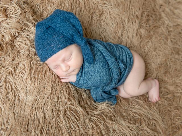 Обои Маленький спящий грудной ребенок в синей вязаной шапке на меховом покрывале