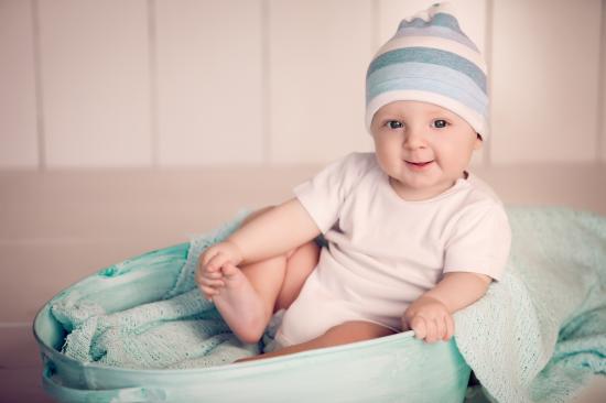 Обои Маленький улыбающийся ребенок сидит в железном тазике