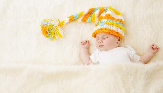 Обои Маленький спящий под меховым покрывалом малыш в вязаной шапке