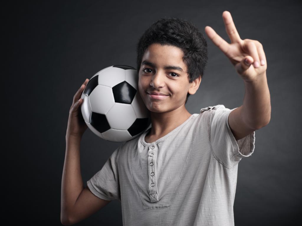 Обои Мальчик с футбольным мячом на плече на сером фоне