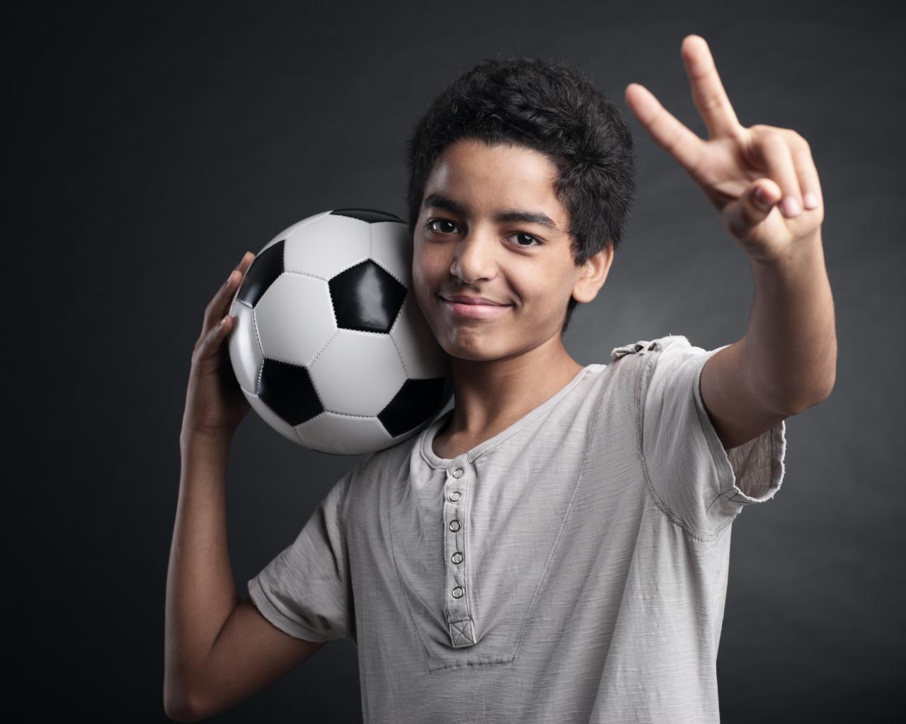 Обои Мальчик с футбольным мячом на плече на сером фоне