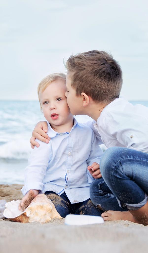 Обои Два маленьких брата сидят на песке на пляже