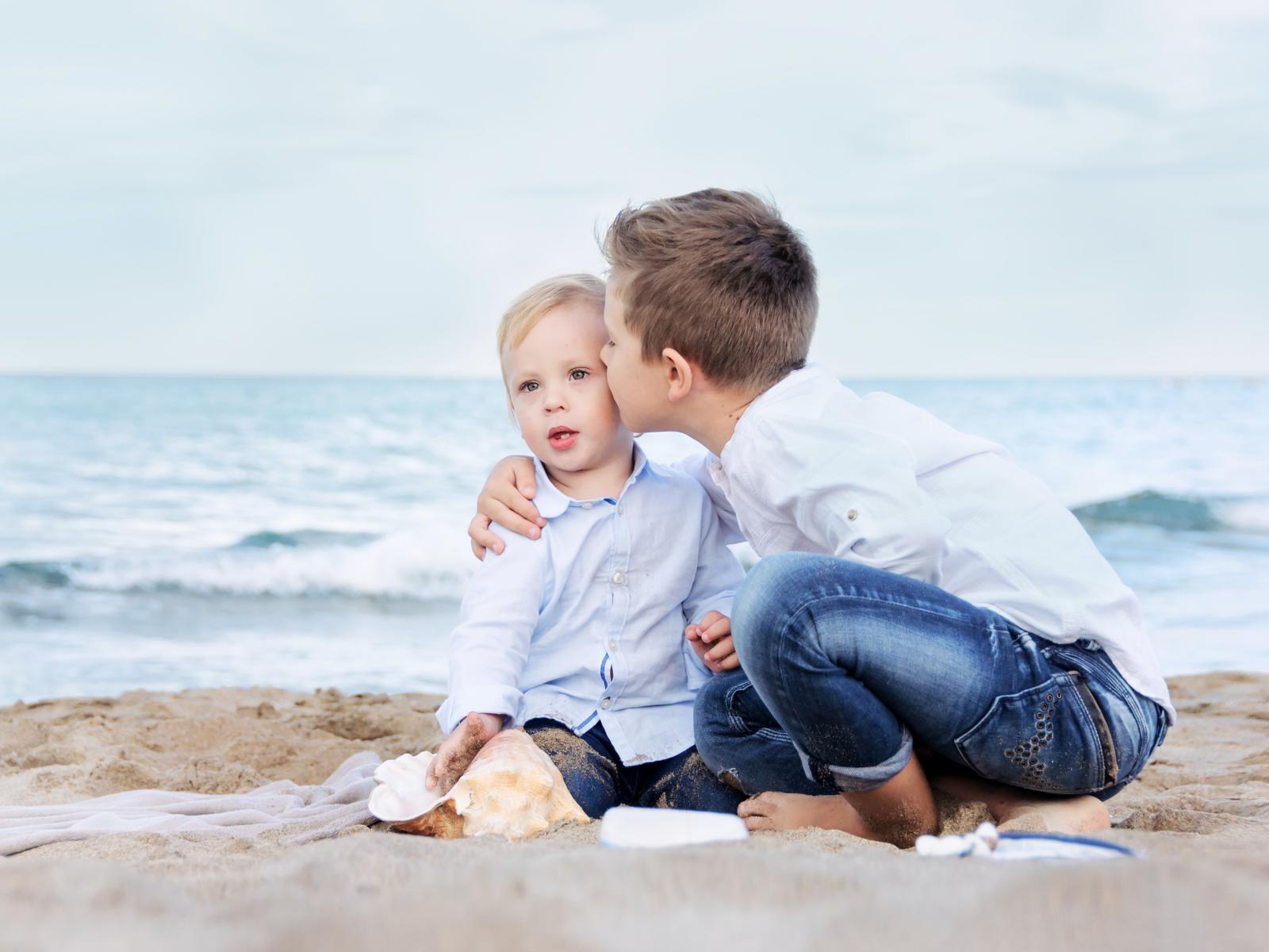 Обои Два маленьких брата сидят на песке на пляже