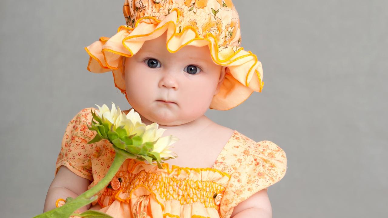 Обои Маленькая девочка в красивом наряде с цветком