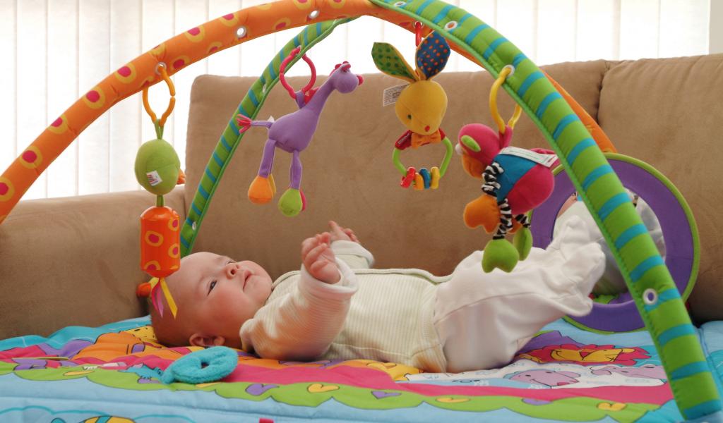 Обои Улыбающийся грудной ребенок с игрушками радуга