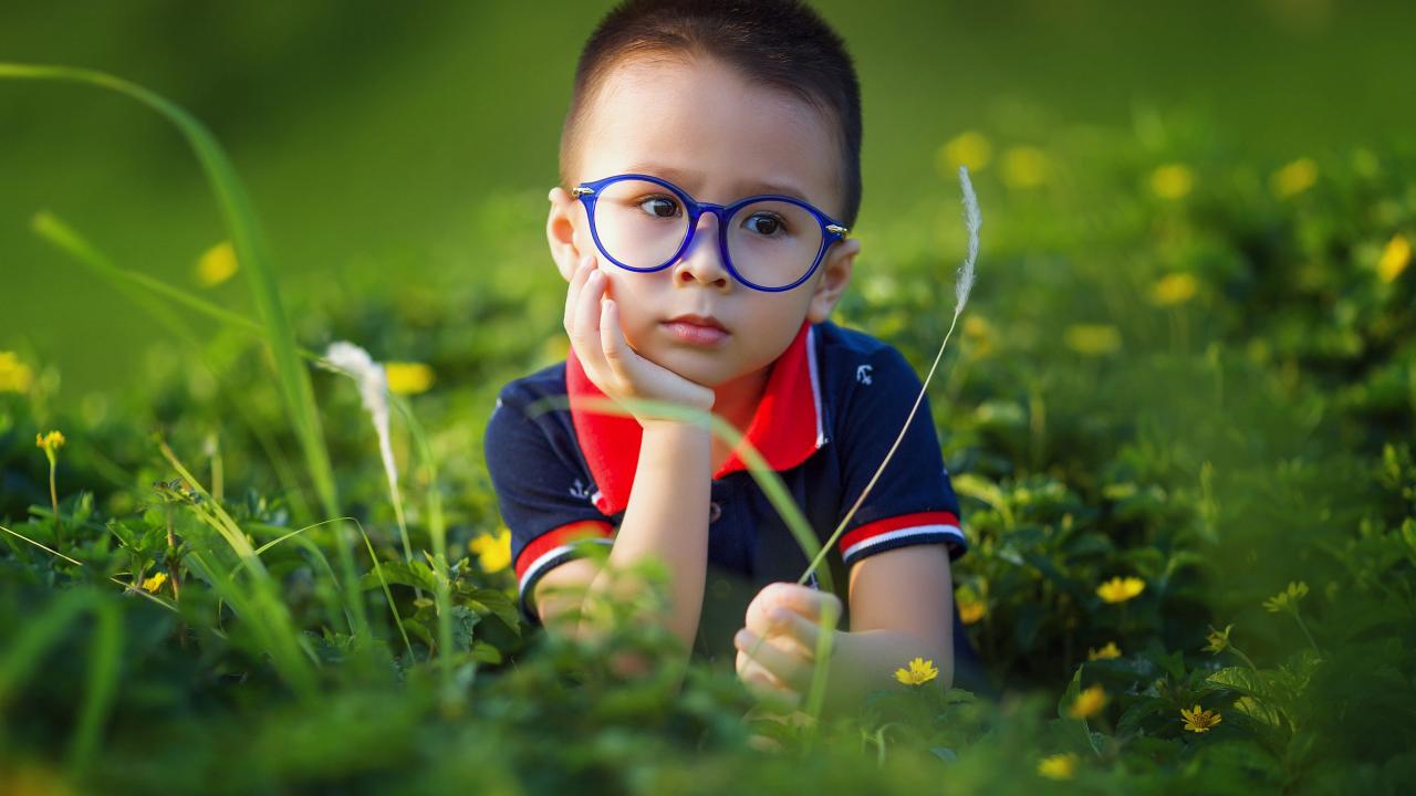 Обои Маленький мальчик в очках лежит на зеленой траве