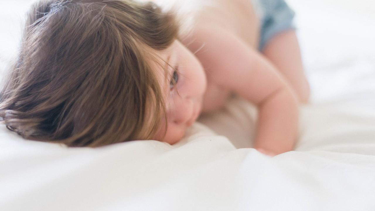 Обои Маленький ребенок с русыми волосами лежит на кровати