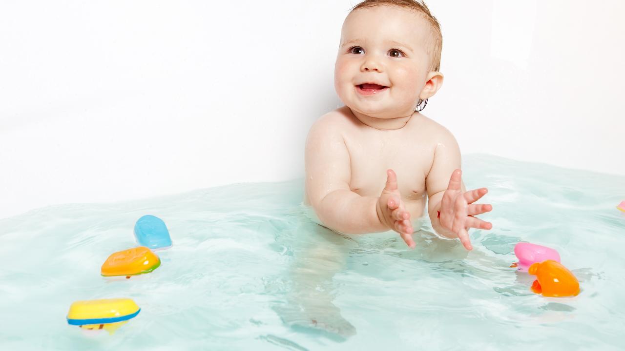 Обои Маленький улыбающийся ребенок с игрушками в ванной