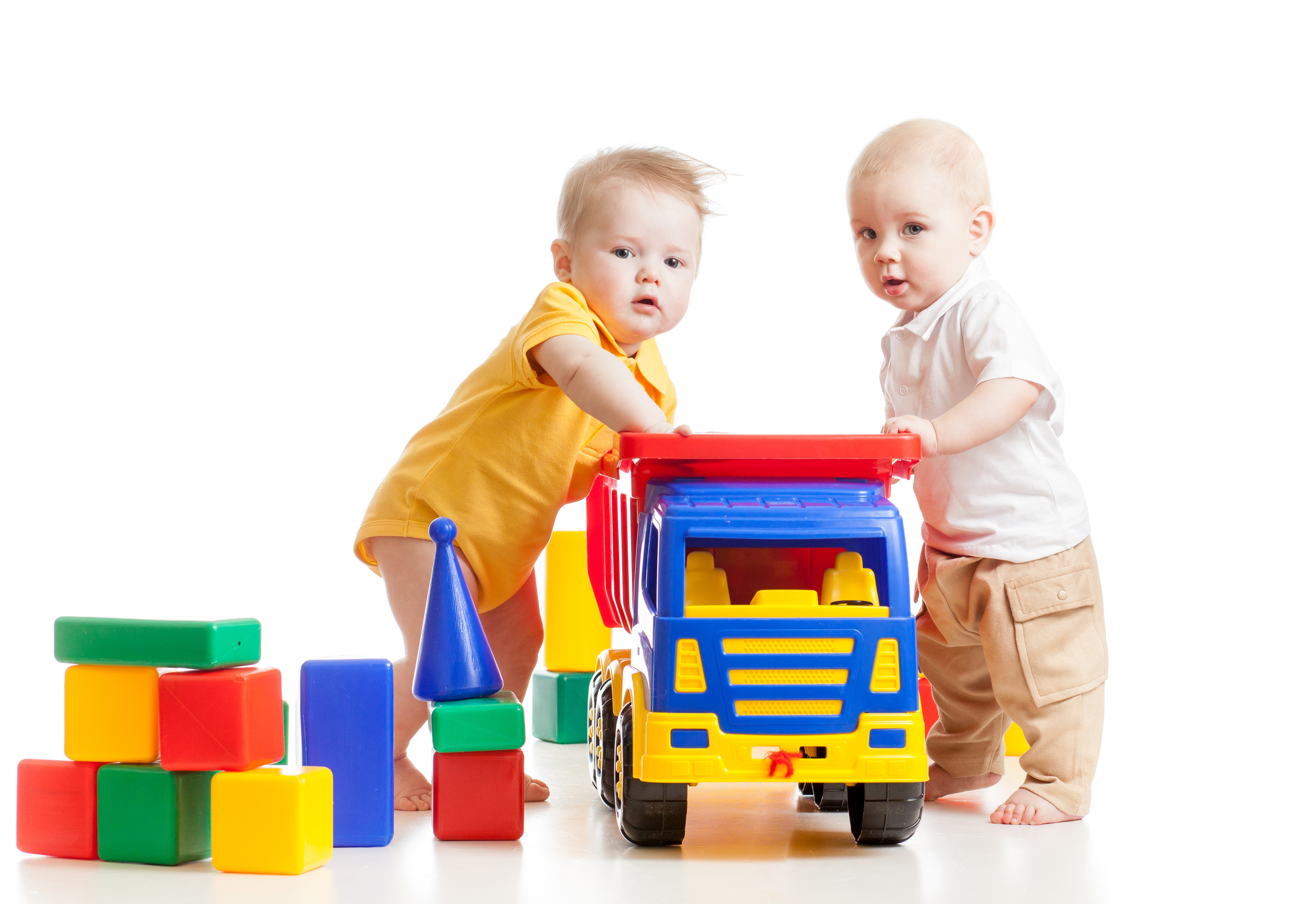 Обои Два маленьких ребенка с игрушками на белом фоне