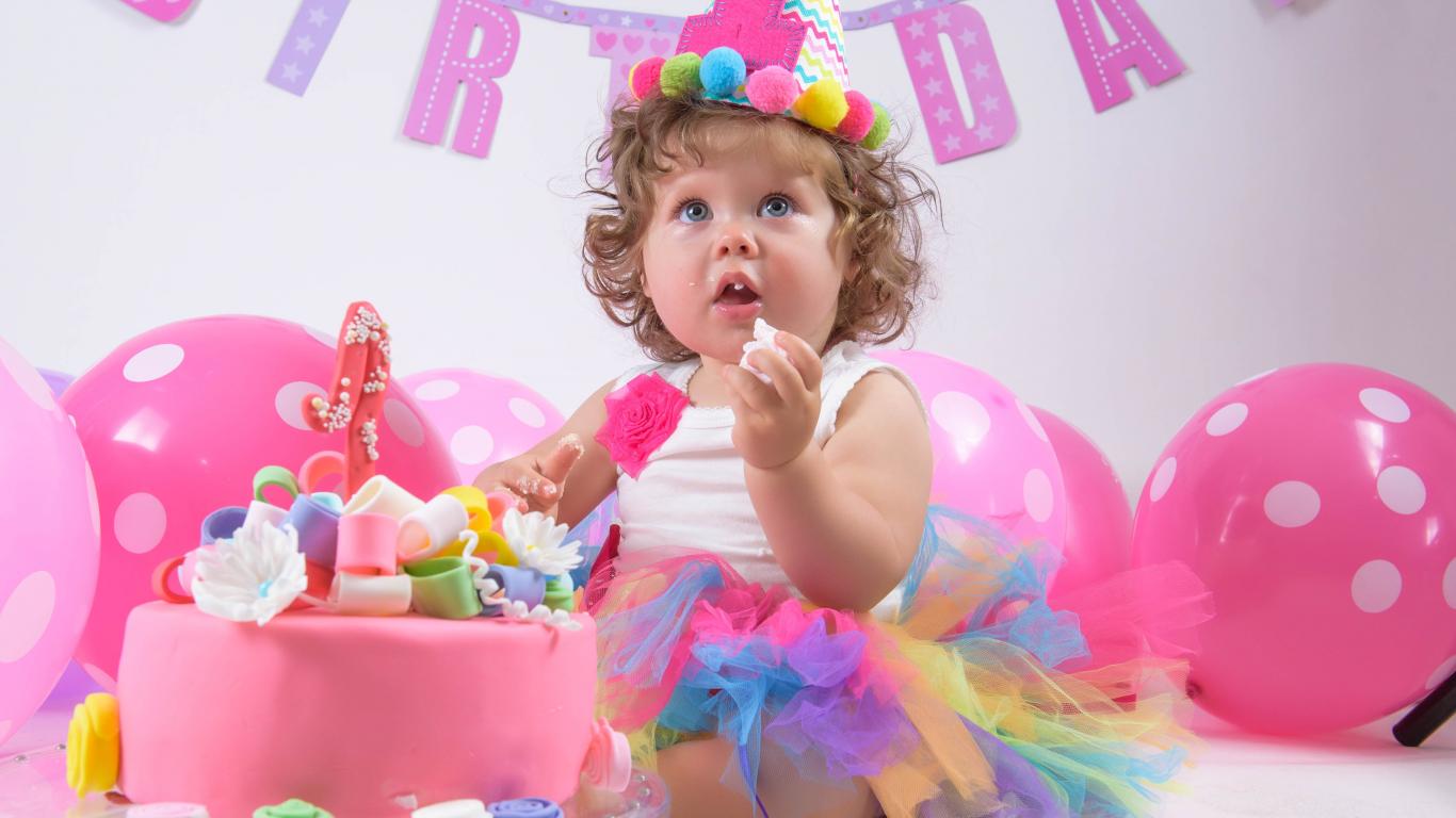 Обои Маленькая девочка с тортом на день рождения 1 год