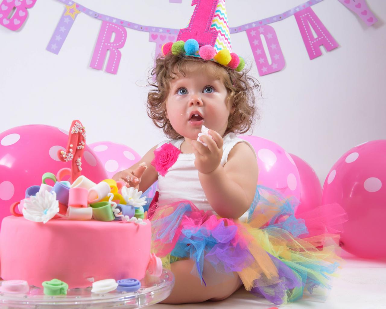 Обои Маленькая девочка с тортом на день рождения 1 год