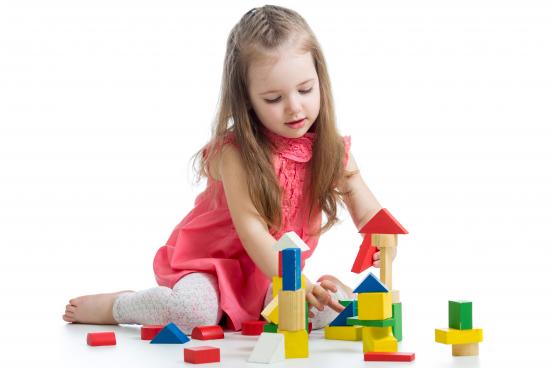 Обои Маленькая девочка строит домик из кубиков на белом фоне