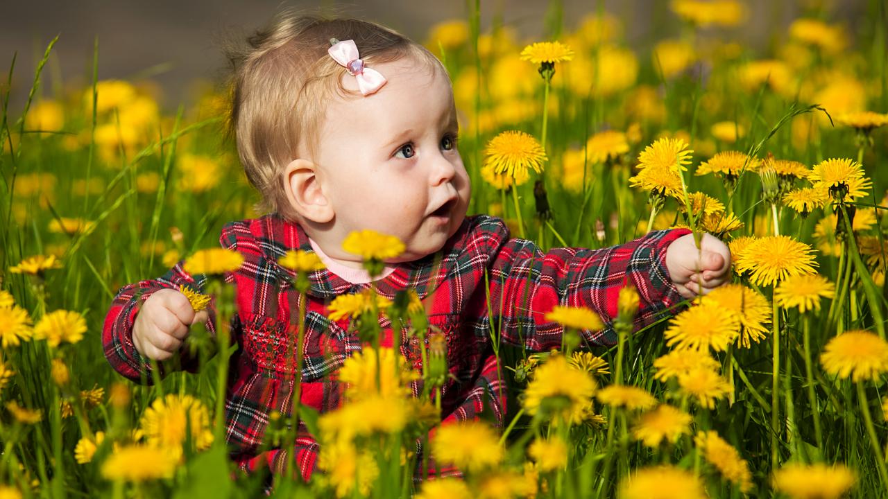 Обои Маленькая милая девочка сидит в желтых одуванчиках
