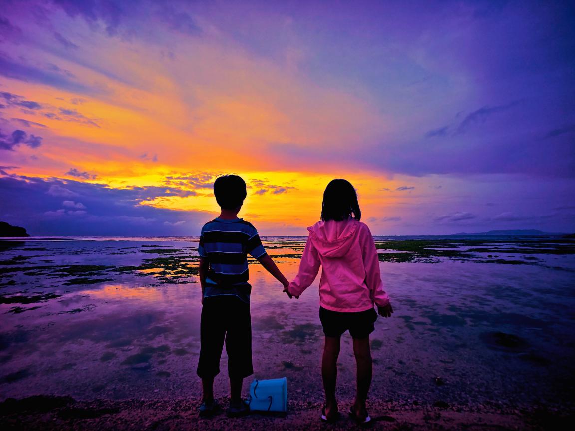 Обои Маленькие мальчик и девочка стоят у воды на фоне заката
