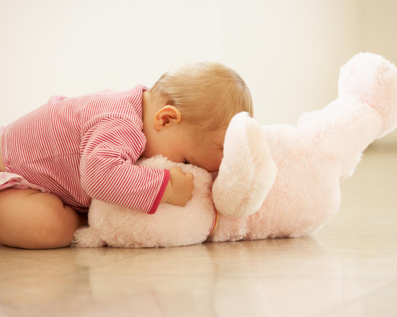 Обои Маленький мальчик с белым плюшевым медведем