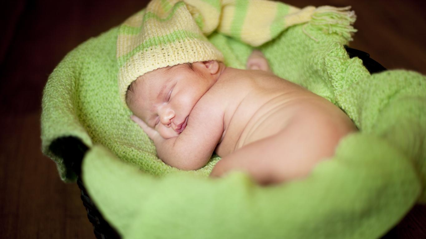 Обои Маленький спящий грудной ребенок на зеленом покрывале