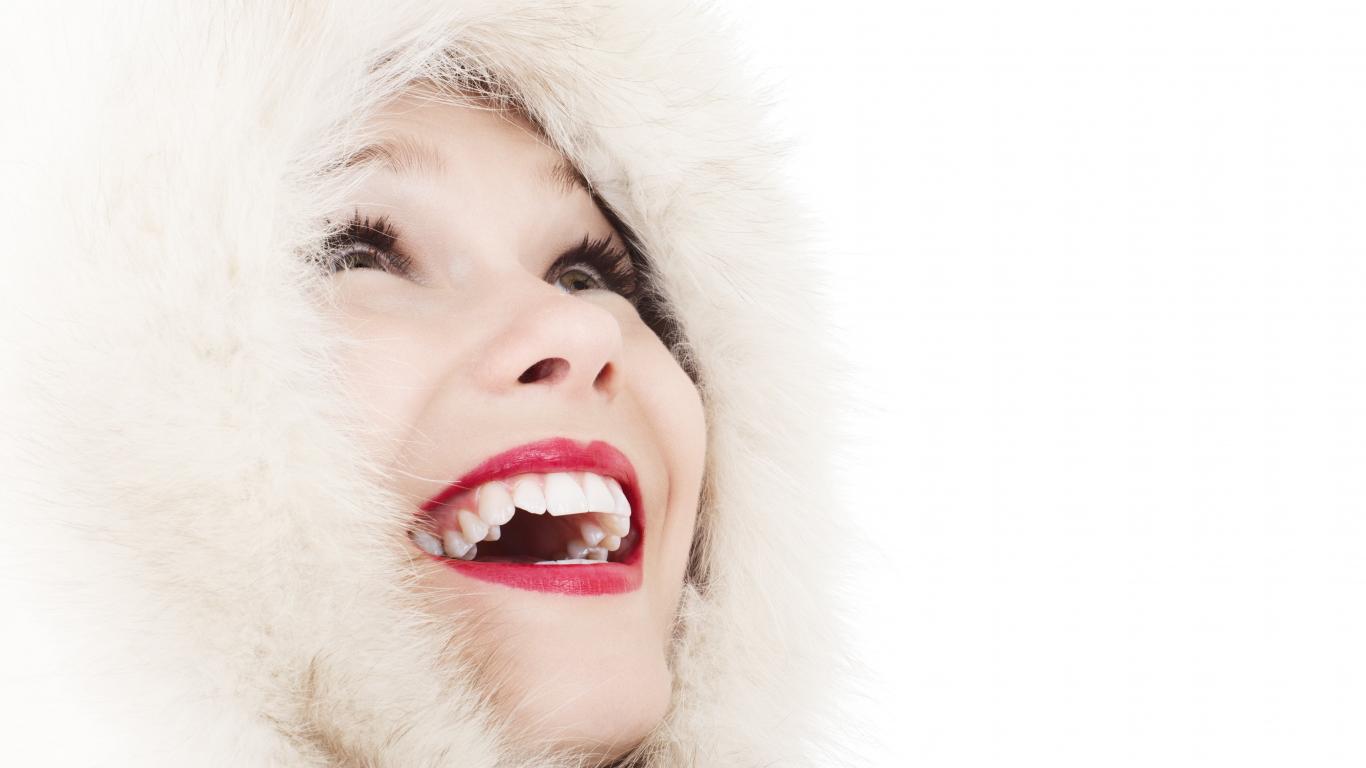 Обои Улыбающаяся девушка в меховом капюшоне на белом фоне