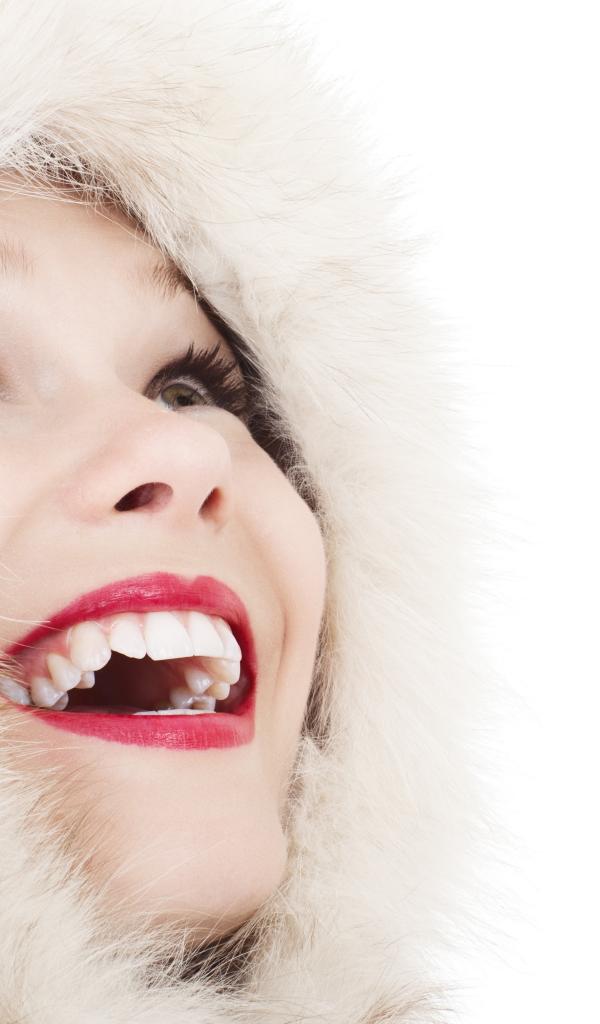 Обои Улыбающаяся девушка в меховом капюшоне на белом фоне