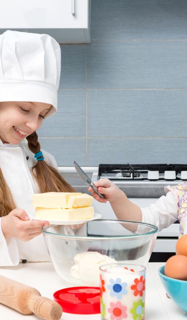 Обои Две маленькие девочки в костюмах повара готовят на кухне