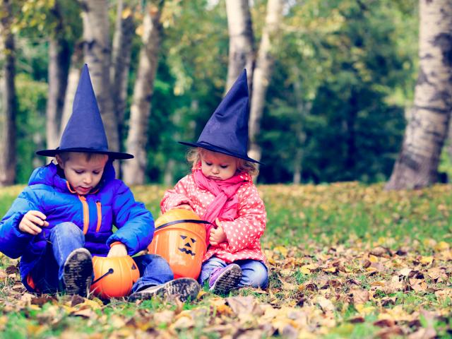 Обои Маленькие мальчик и девочка в лесу на Хэллоуин